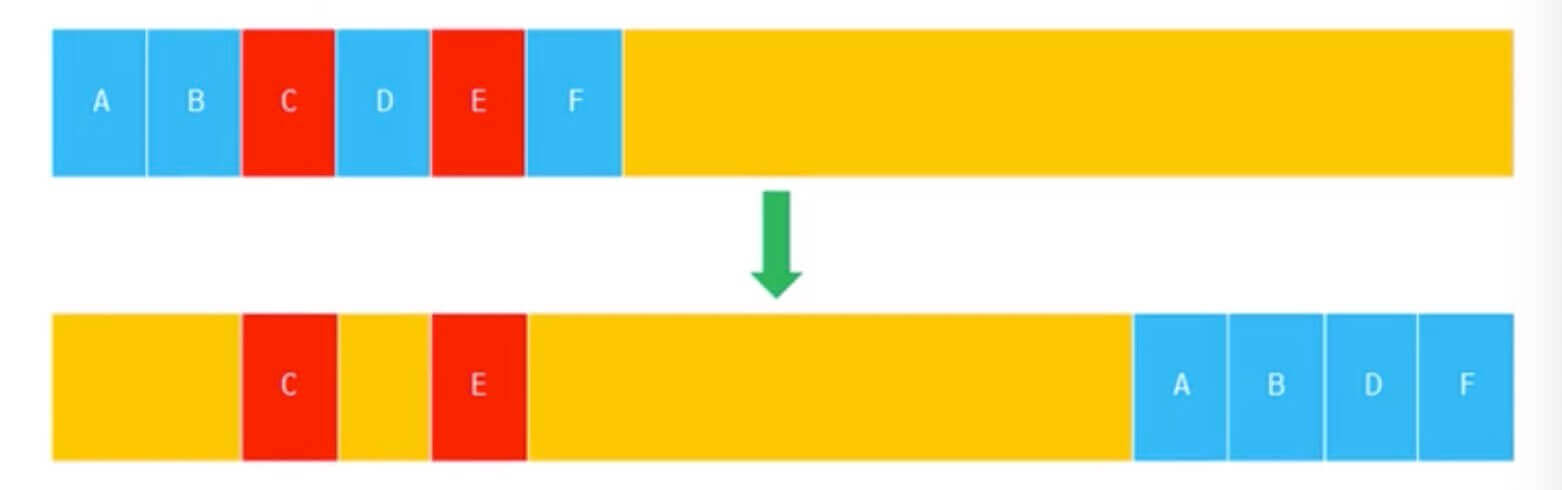 • 标记合并(Mark Compact) Mark Compact 将存活的对象移动到一边,将需要被回收的对象移动到另一边,然后对需要被回收的对象区域进行整体的垃圾回收