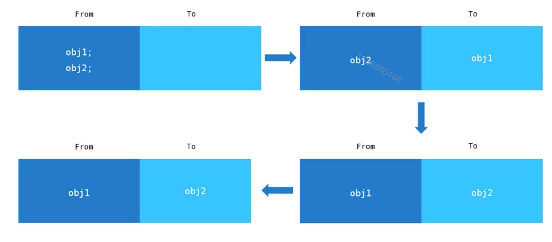 from 和 to 组成一个Semispace(半空间)当我们分配对象时,先在 from 对象中进行分配,当垃圾回收运行时先检查 from 中的对象,当obj2需要回收时将其留在 from 空间,而ob1分配到 to 空间,然后进行反转,将 from 空间和 to 空间进行互换,进行垃圾 回收时,将 to 空间的内存进行释放,简而言之 from 空间存放不被释放的对象,to 空间存放被释放的对象,当垃圾回收时将 to 空间的对象全部进行回收